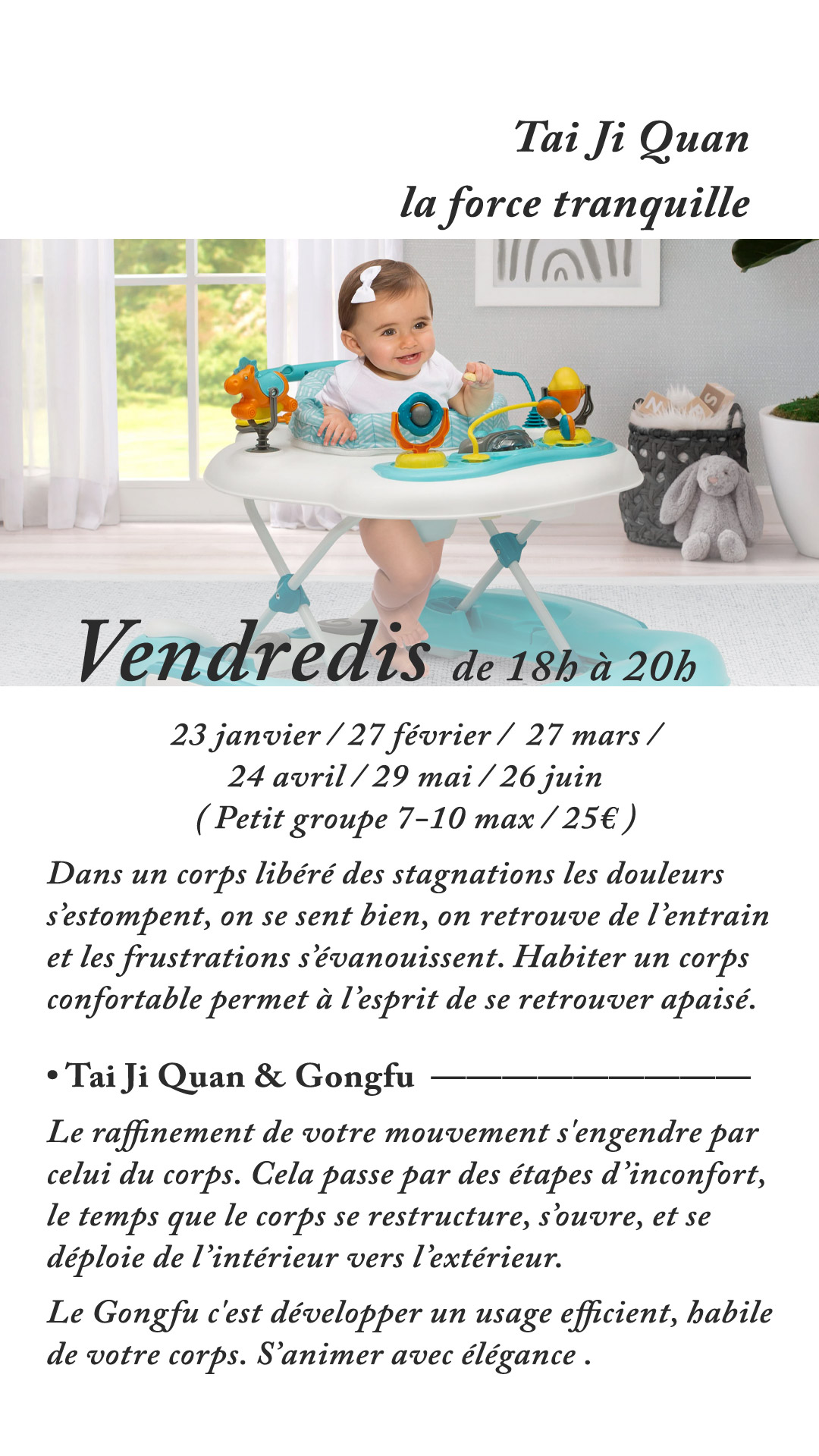 À noter que ma pédagogie n’est pas de la gym douce, relaxation, pleine conscience ou autres adaptations modernes.