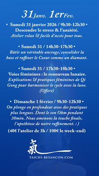 • Samedi 31 / 17h30-18h30 : Voies féminines : le renouveau lunaire. Explications & pratiques féminines de Qi Gong pour harmoniser le cycle avec la lune. (Offert)