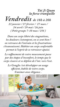 À noter que ma pédagogie n’est pas de la gym douce, relaxation, pleine conscience ou autres adaptations modernes.
